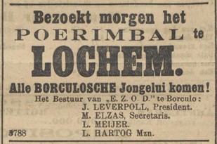 Louis Meijer zat in zijn jonge jaren in het bestuur van de laatste vereniging zo lezen we in de aankondiging van het jaarlijkse Poerimbal.