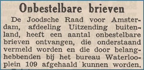 Ondertussen werd aan de Kerkstraat een brief bezorgd. In een huis dat door de beide Joodse bewoners was verlaten. De brief is vervolgens opgestuurd naar de Joodse Raad in Amsterdam die in Het Joodsche Weekblad een rubriek bijhield waarin zij melding maakte van onbestelbare brieven met de oproep die eventueel op te halen. De brief aan Siegfried Isenberg werd in de editie van 8 januari 1943 opgenomen in diezelfde rubriek met vermelding van de afzendster : Terz Isenberg, Theresienstadt.