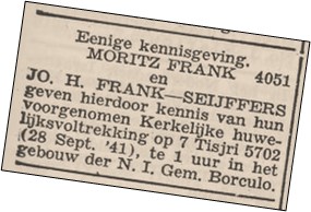 In diezelfde tijd kwam Moritz Frank naar Borculo. Hij was een zoon van een slager in Fürstenau. Zijn ouderlijk huis bood ruimte aan een huissynagoge. Een stil monument vertelt er vandaag de dag wat tijdens de Kristallnacht is gebeurd. Moritz was 35 jaar toen hij op 8 augustus 1941 met Johanna Seijffers trouwde, de dochter van een Borculose tabaksfabrikant. Bij de razzia van 18 november 1942 moesten ook zij zich melden. Johanna werd op 27 november 1942 in Auschwitz vermoord. Moritz zou uitgeput en verzwakt op 23 februari 1945 sterven in het concentratiekamp Buchenwald aan de gevolgen een infectie.