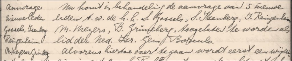 Ik vond de namen van een aantal van hen terug in de notulen van de Joodse Gemeente gehouden kort na de Kristallnacht van november 1938. Gossels, Isenberg, Reingenheim en Grüneberg. De vergadering besprak hun verzoek om toe te mogen treden tot de gemeente.